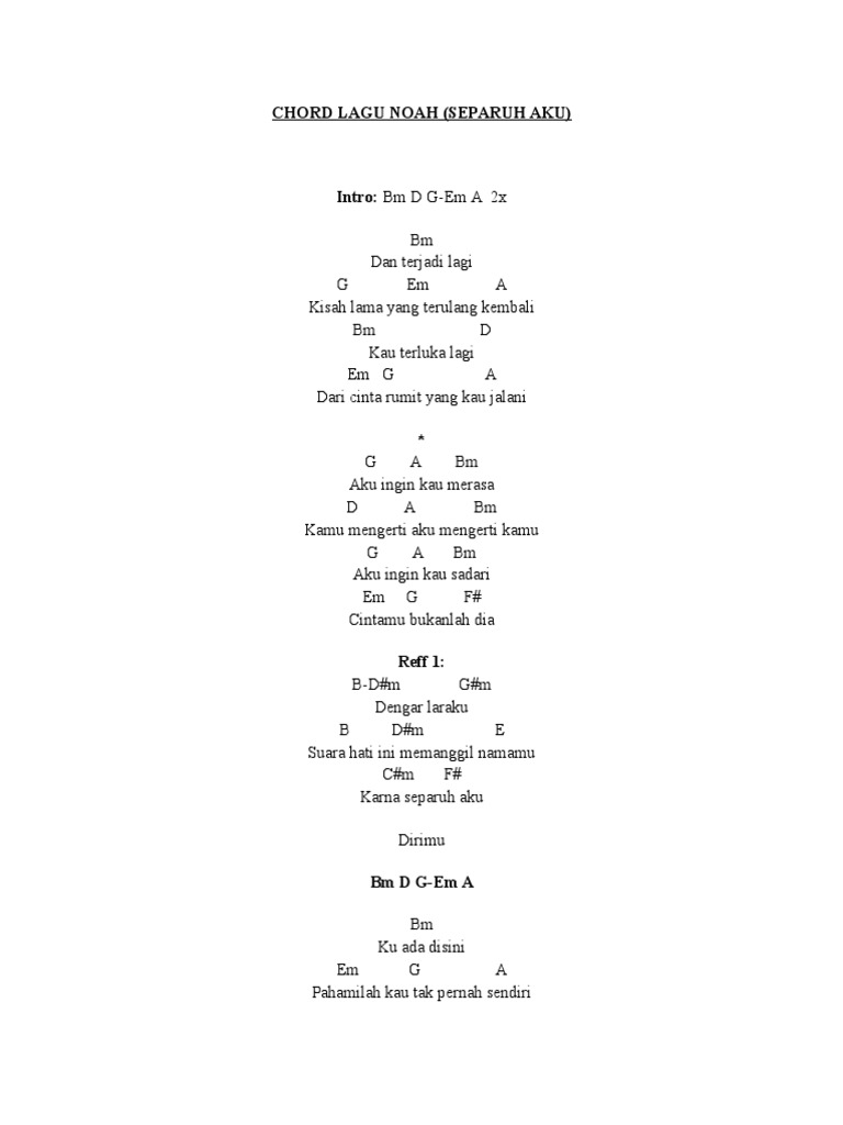 Chord Lagu Noah Separuh Aku - Dan terjadi lagi kisah lama yang terulang kembali kau terluka lagi dari cinta rumit yang kau jalani. Chord Lagu Noah Separuh Aku : Chord gitar lagu noah yang berjudul separuh aku adalah salah satu yang paling dicari oleh generasi milenial.