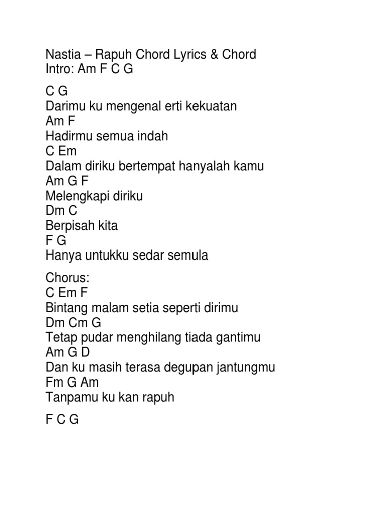 Chord Lagu Rapuh Padi / C em ku larut luruh dalam keheningan hatimu am f g jatuh bersama derasnya tetes air mata c kau benamkan wajahmu yang em berteduhkan duka am f g melagukan kepedihan di dalam jiwamu.