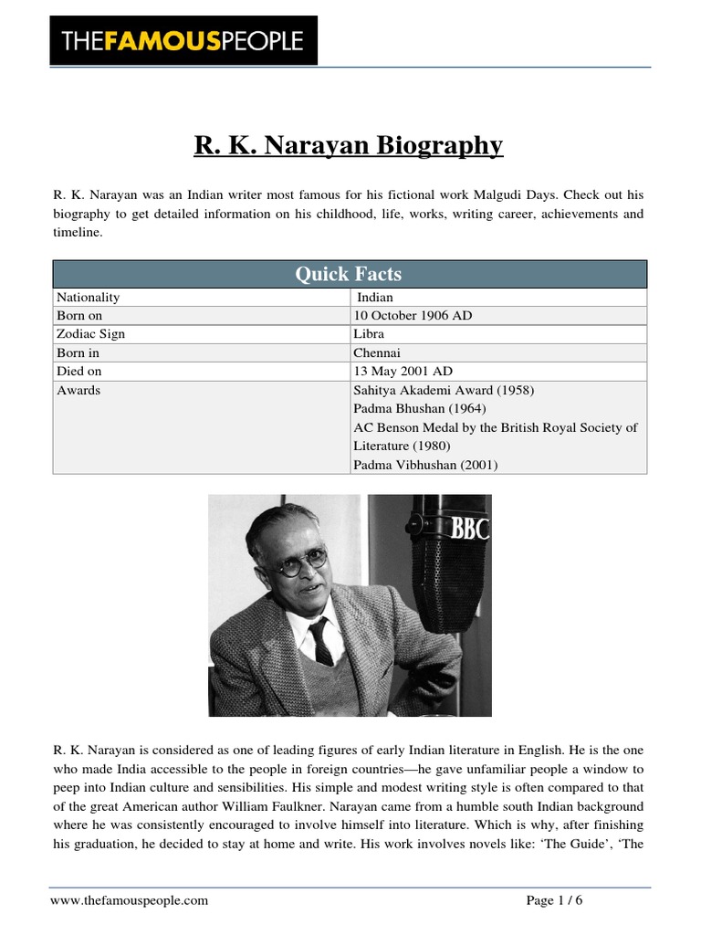 Rk Narayan Biography Pdf / Narayan's most celebrated novel, the guide won him the national prize of the indian literary academy, his country's highest literary honor.